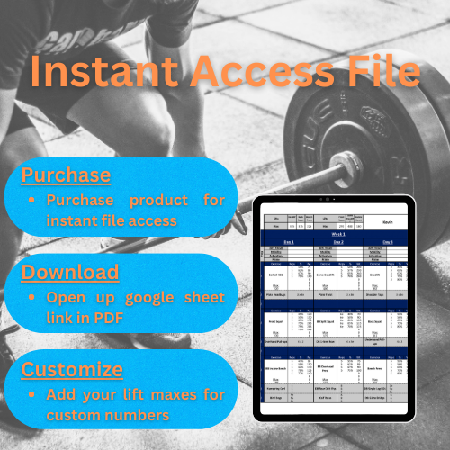 - Easy fill Google Sheet that auto fills all your main lift numbers based of Maxes of Trapbar Deadlift, Back Squat, and Bench Press
